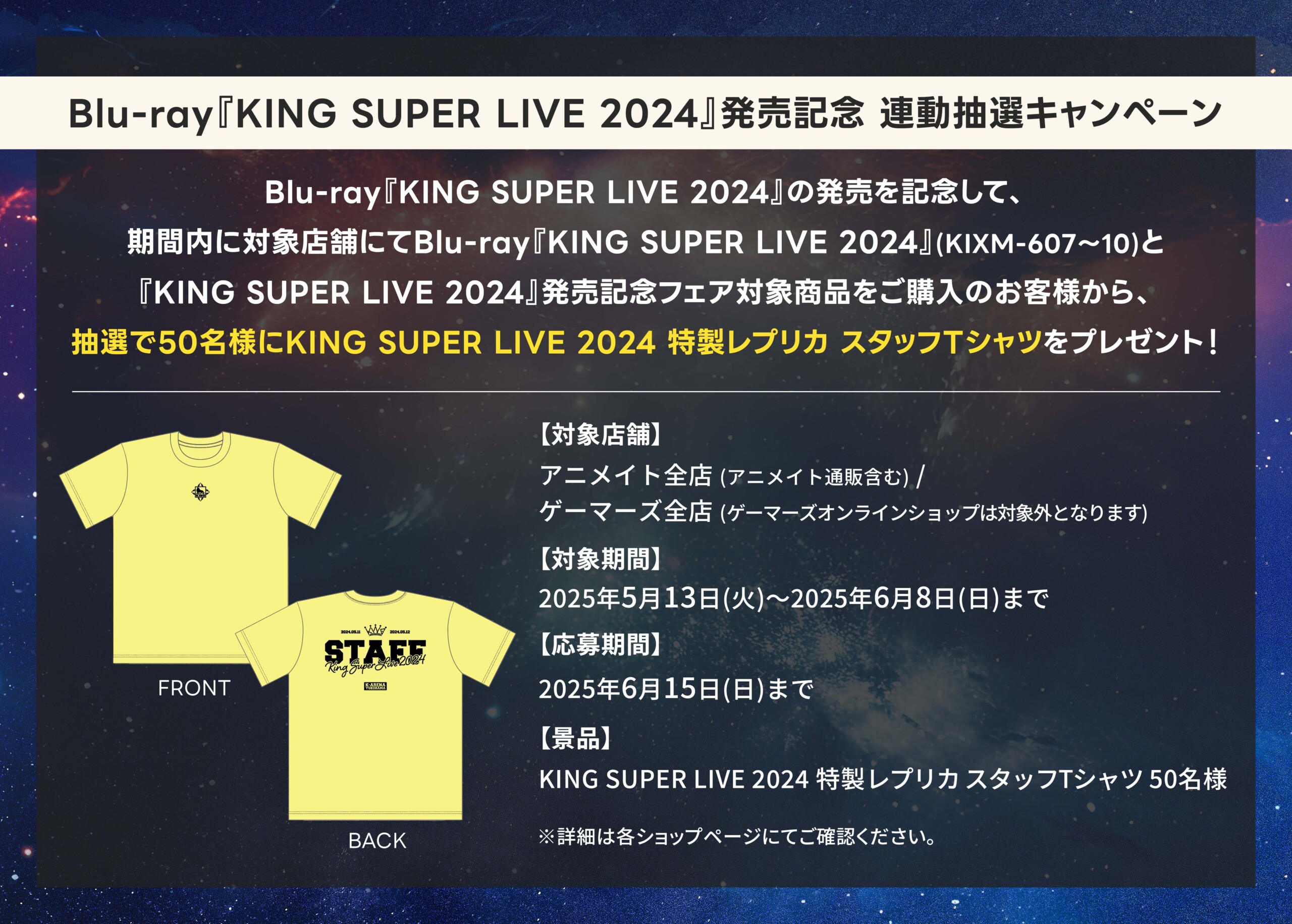 期間内に対象店舗にてBlu-ray『KING SUPER LIVE 2024』(KIXM-607~10)と『KING SUPER LIVE 2024』発売記念フェア対象商品をご購入のお客様から、抽選で50名様にKING SUPER LIVE 2024 特製レプリカ スタッフTシャツをプレゼント!■Blu-ray『KING SUPER LIVE 2024』発売記念 連動施策 対象商品