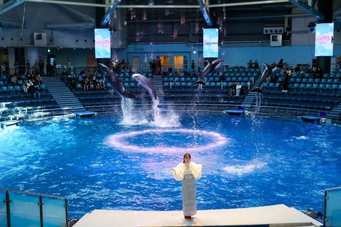 昨夏ももクロが開催した「ハマの夜祭り番長襲名記念ももクロ夏のバカ騒ぎ2025 in 横浜スタジアム」のライブ映像や音源とともに春を超えて夏まで先取りするような熱量あふれるパフォーマンスやメンバーカラーやライブの世界観から着想を得た色彩豊かな生きものたちをご覧いただけるコラボ水槽を楽しめる同コラボ。記者発表には、ももクロの「百田夏菜子」が特別ゲストとして登場し、スペシャルドルフィンパフォーマンスのお披露目やトークセッションでコラボコンテンツの魅力を紹介。