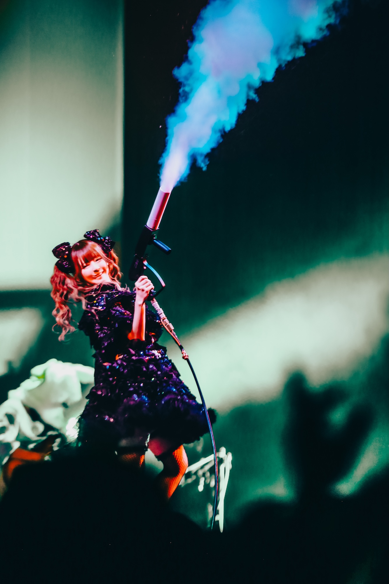 童謡を独自にアレンジしSNSでヒットした“カエルのうた”をはじめとする「闇堕ち童謡メドレー」、殺虫剤を撒く歌詞になぞらえCO2スモークボンベを噴射する「G」など、自由な発想のパフォーマンスで観客を魅了した。